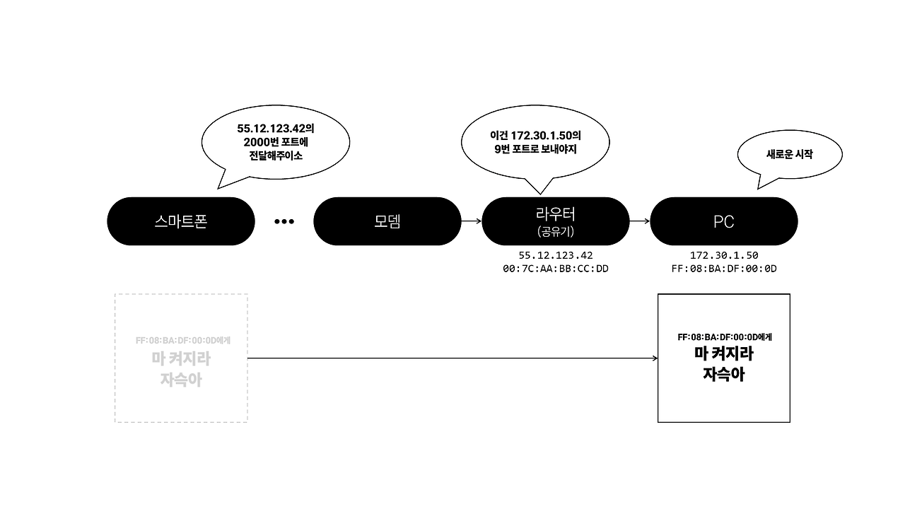 라우터의 포트포워딩을 통해서는 일단 ‘중계기’로 보내는 것이다. 그리고 나서 중계기가 해당 패킷을 브로드캐스트한다. 이를 통해 라우터에 연결된 모든 장치에 이 매직패킷이 전달되는데, 이는 UDP의 형태로 일반적으로 WOL을 위해 사용되는 9번 포트로 설정한다.