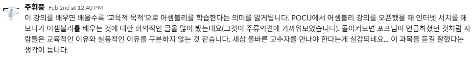 만약 어셈블리를 POCU에서 배우지 않고 그냥 '이건 이렇고, 저건 저렇다'는 식의 무료 강의로 배웠다면 나는 그냥 '어셈블리 코드를 읽을 줄 아는 사람'이 되는 것에 그쳤을 것이다. 하지만 POCU에서 어셈블리를 배운 결과 직접 어셈블리로 코드를 작성할 줄 알게 되었고, 지금은 간편하게 제공되는 명령어 뒤에서 어떤 일이 일어나는지 이해하게 되었고, 컴퓨터를 더 깊게 이해하게 되었다.