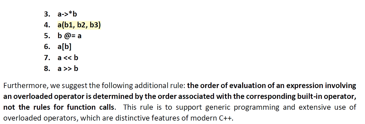위 내용은 C++17의 accepted proposal인 P0145의 내용 중 일부입니다. 여기서 4번 항목을 보고 함수 인자 평가 순서가 LTR로 보장된다는 오해가 생긴 모양입니다. 그러나 이전 페이지의 내용을 잘 읽어보면, ‘다음 표현식은 a, b, c, d 순서로 평가된다’ 라고 쓰여있습니다. 만약 a(b1, b2, b3)에서 b1, b2, b3 순서로 함수 인자를 평가하고자 하는 의도였다면 a(b, c, d)라고 기재했을 것입니다.