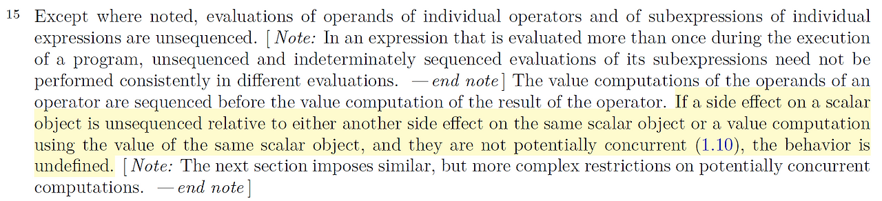 여기에 더해 sequencing에 대해서 알아야하는데, C에서의 sequence point가 C++11부터는 sequencing으로 대체되었습니다. C에서의 sequence point란, ‘이 앞에서 연산들이 다 마무리 된다’는 개념입니다. 예를 들어, 세미콜론은 sequence point입니다. 세미콜론 앞에 있는 연산들은 세미콜론 이후에 나오는 코드들이 실행되기 전에 완료되는 것이 보장되니까요.