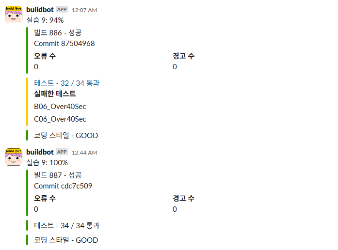 그리고 그 실습과 과제를 ‘빌드봇’을 통해 평가받는다. 각 과목을 원활하게 pass하기 위해서는 모든 실습과 과제에서 만점을 받아야하는 구조라서, 배웠던 개념을 온전히 이해하고 제대로 구현해야만한다. 웬만한 대학에서는 과제에 대한 평가를 이렇게 엄격하게 하지 않는다. 그냥 간단한 테스트만 하거나, 심지어는 그냥 실행 스크린샷(혹은 영상)만 제출받는 경우도 있다.