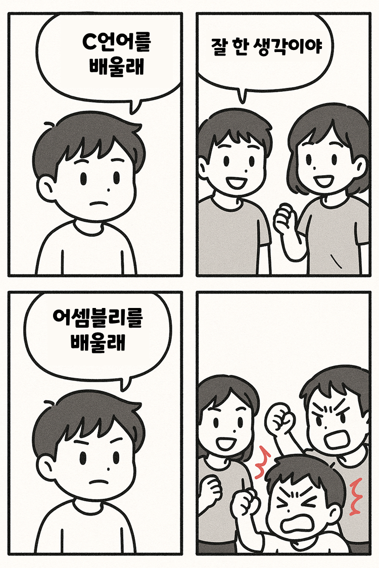 사람들은 C에 대해서는 한없이 관대해진다. 그들 중 9할 이상은 실무에서 C를 사용하지 않을 것임에도 C를 공부하는 것에 대한 교육적 목적을 ‘너그러이’ 이해해준다. 허나, 어셈블리는 왜 그러한 ‘자비로움’에서 예외가 되어야하는가?
