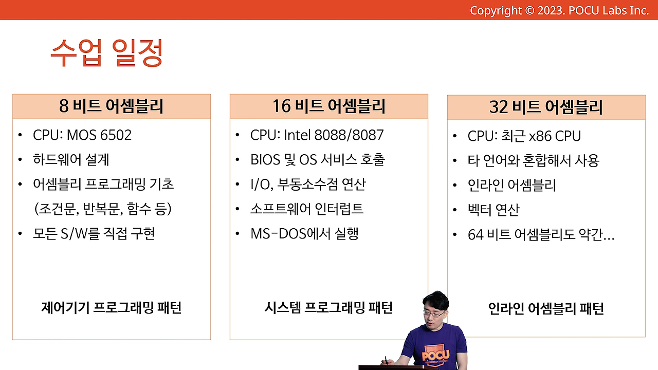 POCU의 <어셈블리 프로그래밍> 과목은 위와 같은 커리큘럼을 가진다. 혹자는 8비트 어셈블리부터 시작하는 것이 과하다고 생각할지도 모르겠다. 나도 처음에는 그렇게 생각했다.