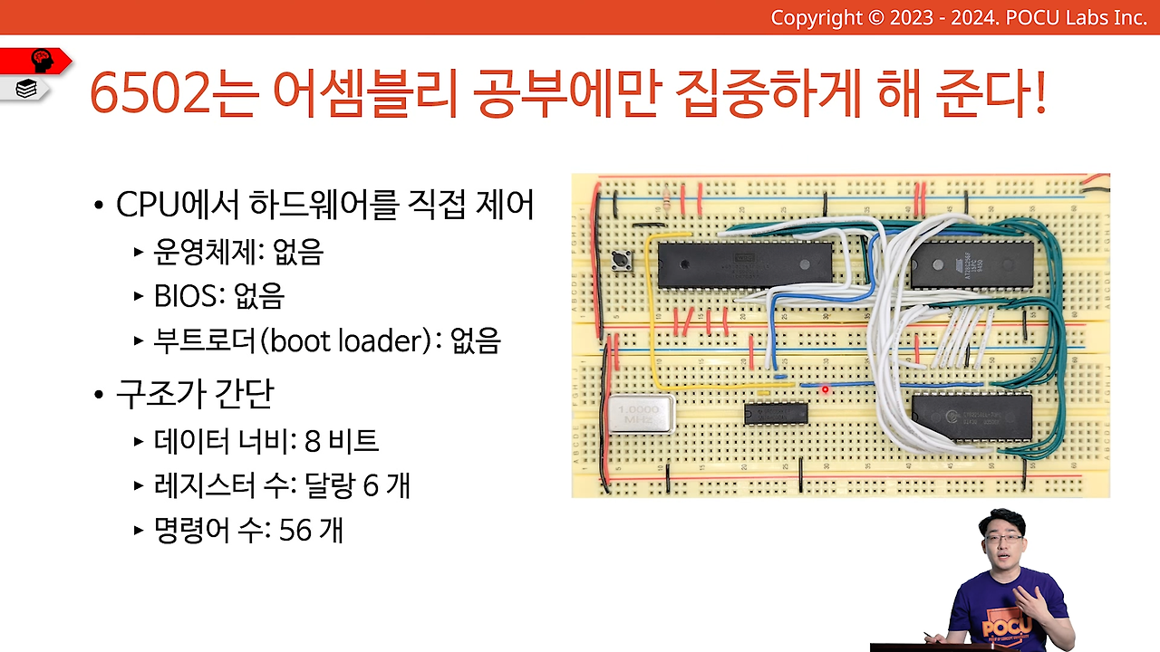 6502 어셈블리를 배우는 동안에는 무려 브레드보드에 직접 컴퓨터를 만들어본다. 이 과정은 POCU에서 제공하는 시뮬레이터를 통해 진행할 수도 있다. 이러한 과정에서 각 부품간의 타이밍 다이어그램을 확인하고, 사이클 하나하나를 소중히 하면서 코딩해나간다.