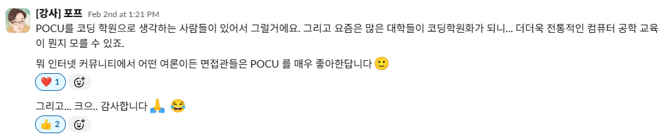 POCU의 강의는 완벽에 가깝다. 내가 왜 이렇게까지 극찬을 하느냐면, 강의를 듣는 중에도 강의 구성의 치밀함이 느껴졌기 때문이다. POCU의 코스들은 ‘어떻게 하면 잘 가르칠까’하는 깊은 고민을 거치고 나오는게 보인다. 신규 코스를 출시하는 텀이 긴 것도 이러한 맥락으로 생각된다.