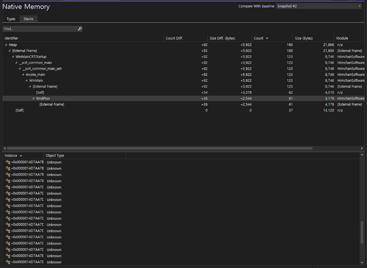 분명하게 메모리가 증가하고 있다. 화면을 키우면 당연히 증가할 수 있겠지만 이미 비정상적인 증가(화면을 줄여도 메모리가 해제되지 않음)가 있음을 확인했으므로 한번 살펴본다.