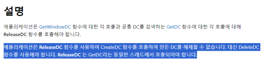 특히 MSDN에서는 ReleaseDC는 CreateDC를 호출해서 만든 DC를 해제할 수 없음을 명확히 하고 있다.