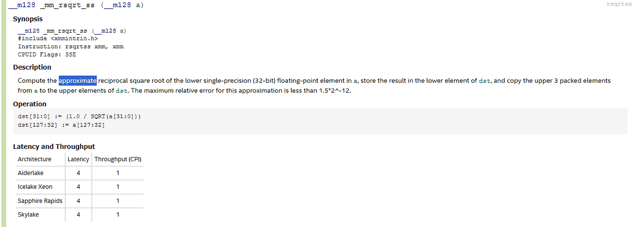 그런데, 마지막 의문이 하나 있다. 왜 rsqrt를 사용하지 않고 직접 역수를 구하는 걸까. 해답을 찾기 위해 인텔 개발자 문서를 찾아보니 rsqrt는 값을 근사(approximate)하는 명령이라고 한다. 오차는 최대 1.5*2^-12인데, 반올림해서 대충 0.0004 정도 된다. 이 정도면 오차가 충분히 작지 않나 싶은데, 에픽게임즈의 판단은 아니었나보다.