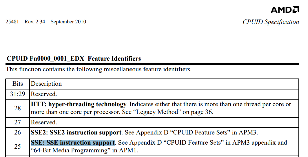 그리고 인텔과 AMD 모두 EDX의 25번째 비트를 통해 SSE 지원여부를 반환한다는 것을 확인했다(혹시나 둘이 다를까봐 긴장했음).