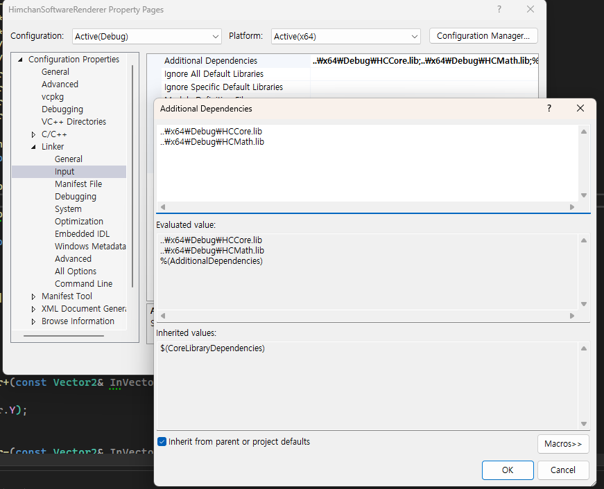 HimchanSoftwareRenderer에서는 Additional Dependencies에서 위 두 프로젝트의 결과물을 가져오도록 했다.