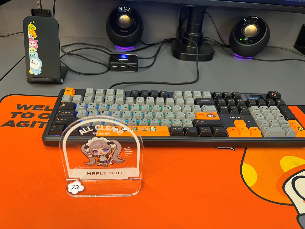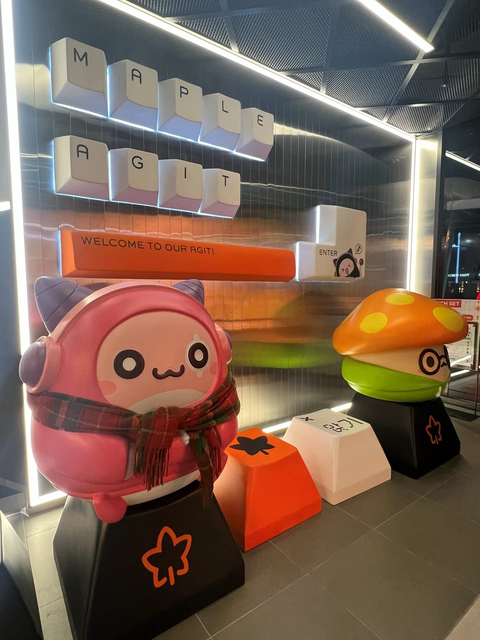 자리에 앉으면 자리 청소가 완료되었다는 말과 함께 브루미가 반겨준다! 키보드, 키패드, 마우스, 무선 충전기 모두 메이플 아지트의 굿즈로 돼있다.