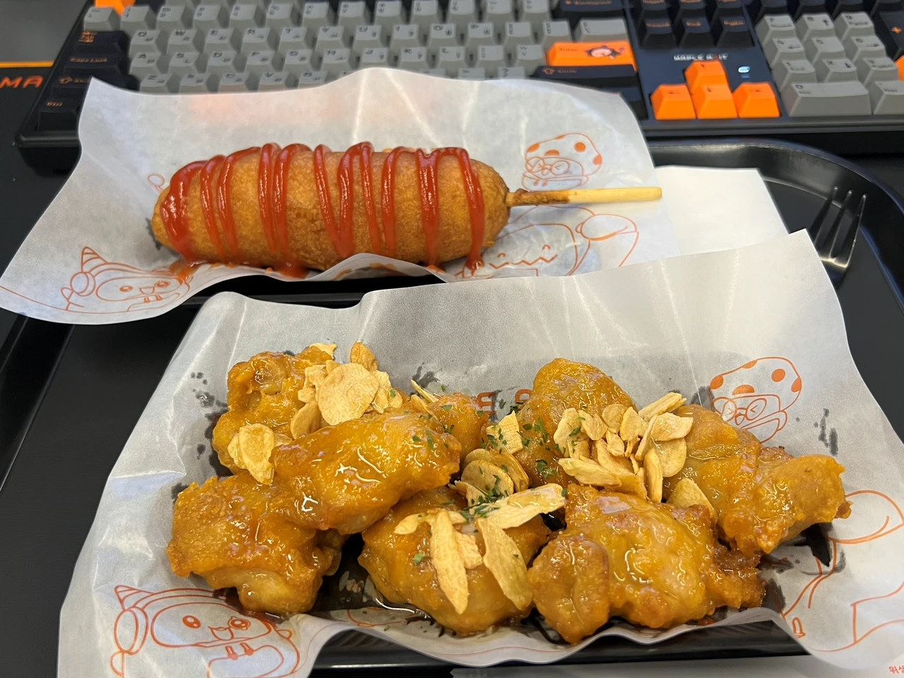 핫도그는 바삭한 ‘명랑 핫도그’ 같은걸 기대했는데 길거리에서 파는 축축한 빵 식감의 핫도그였다. 몇 입 먹다가 소시지만 먹었다.