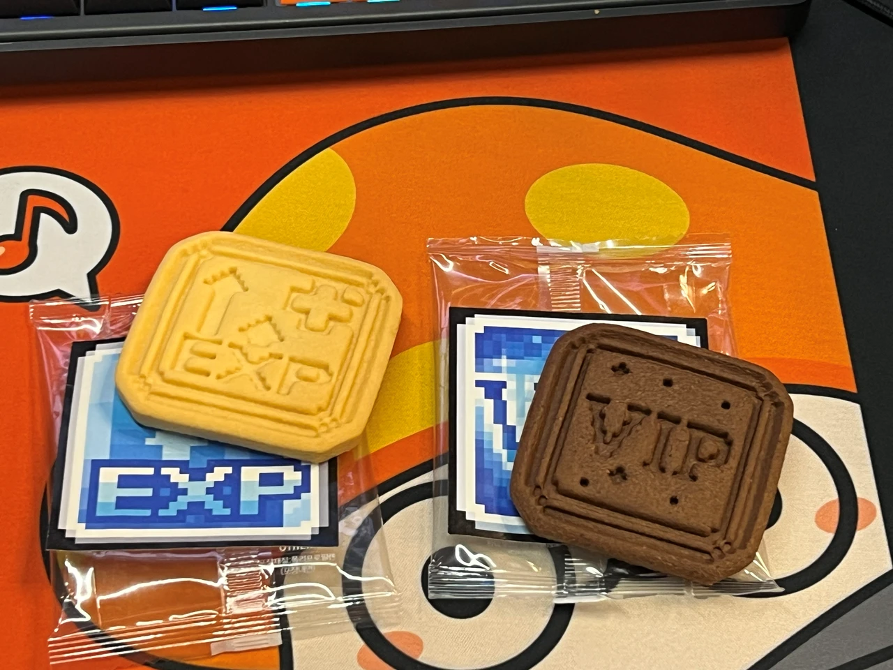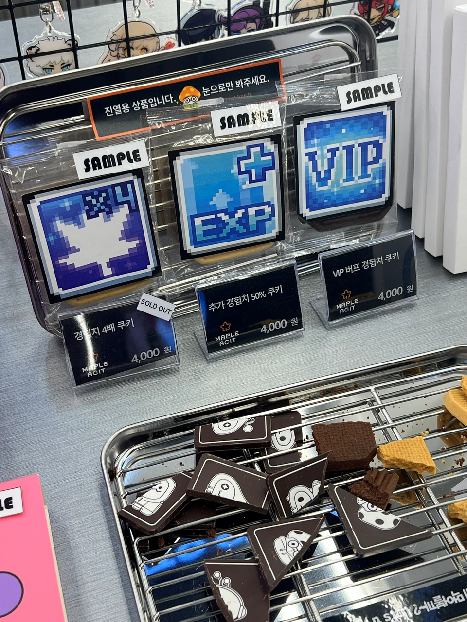그리고 다음날, 굿즈샵에도 방문해봤다. 일단 가장 눈이 갔던건 경험치 버프들의 쿠키! 초콜릿과 쿠키들은 시식할 수 있게 나와있어서 먹어봤는데, 기본적이지만 맛있는 쿠키였다. 동네 맛있는 베이커리에서 직접 구운 쿠키 같은 그 맛! 거기에 경험치 버프 아이콘이 너무 귀여웠기에 하나씩 샀다. 다만 경험치 4배 쿠키는 아쉽게도 품절이라 나머지 두 종류만 구매했다.