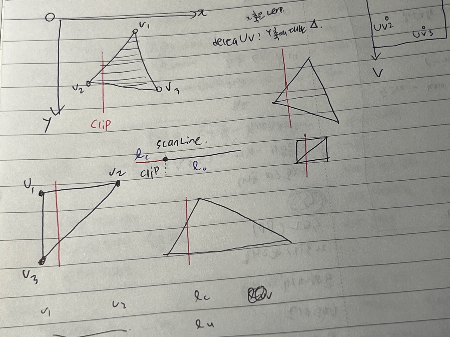 해결된 코드. 생각보다 매우 간단한데, 클리핑된 좌표는 따로 저장하면 된다. 그러면 자연스럽게 UV 좌표를 보간할 때에는 클리핑 되기 전 좌표를 기준으로 되면서 문제가 해결된다.